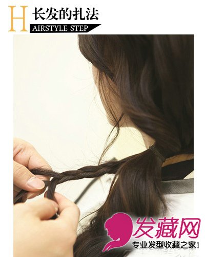 STEP 5:然后,蓬松的波浪卷发侧扎成低马尾,取一小束头发编发。