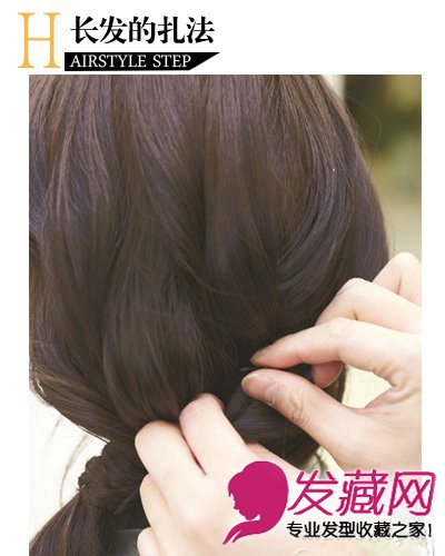STEP 6:将编好的小辫子圈住橡皮筋,用发夹固定在里面。