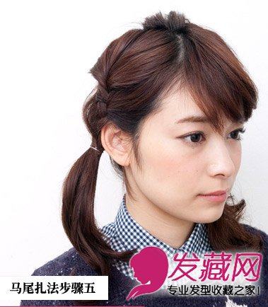 step5:再将右侧剩下的头发固定在一起,在耳朵中间位置绑成一个小马尾。