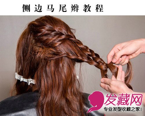 step 6:从辫子下面取三小束头进行编发,方式与上面相同,之后加入辫子当成新辫子的一个发束。