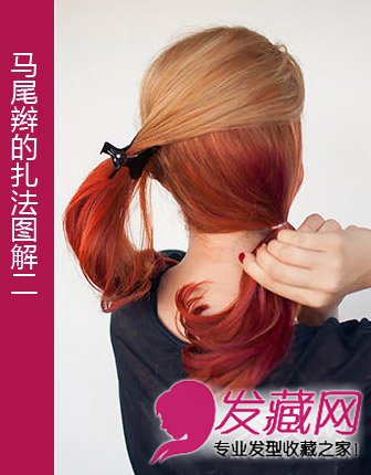 step2:上部分头发先用发夹固定,下方的头发绑成低马尾。