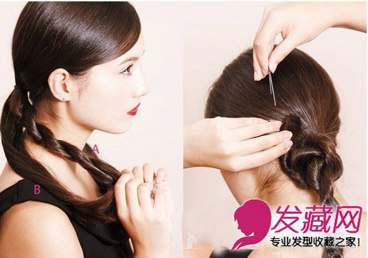 将全部头发分成A、B、C三部分,将A发束分成两部分进行扭转,拉扯B发束,缠绕发尾扭转成花苞状,发尾用发夹固定在头顶。