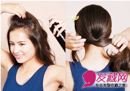 先在头发喷上定型水,将所有的头发绑成简单的马尾。