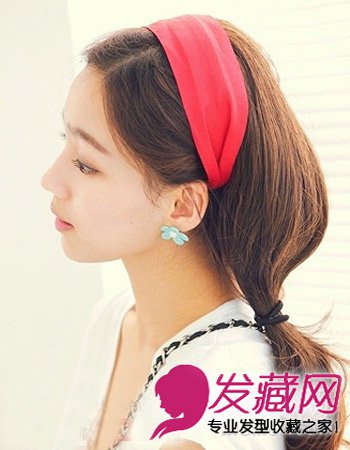 蓬松马尾,典型的韩式发型扎法,红色的发箍,很亮眼。侧面更显女生的魅力,简约又时尚。