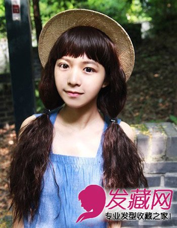 可爱双马尾,扎的蓬蓬松松的,显得头型十分的饱满。齐刘海修饰了脸型,配一顶编帽,越发的小清新。