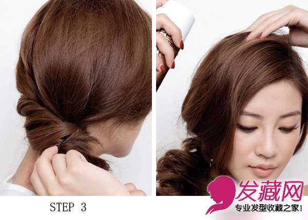 step4.轻轻提拉出右侧脑顶的头发,使其看起来饱满,再用少量发胶定型。
