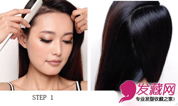 step1.使用尖尾梳将前额头发偏分成圆弧状,少许发胶固定。