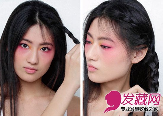 step2.一直顺延编到耳后靠近肩膀位置,贴在脑后用卡子固定。