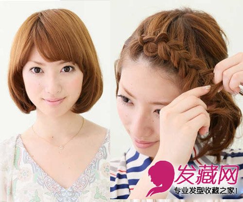 把波波头短发梳整齐,从刘海开始编织麻花辫。