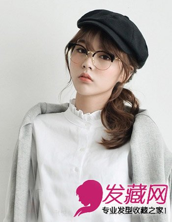 一款精致的短发马尾发型,在侧边扎一款精致的卷发马尾发型,唯美的长卷发刘海搭配上复古帽子的搭配显得十分有学生气息。