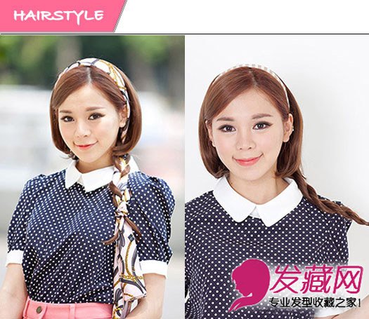斜刘海的卷发和低马尾梳发设计,让女生看上去颇显秀气,用时尚的头巾和简单的编发进行装饰,尽显女生优雅端庄的气质。