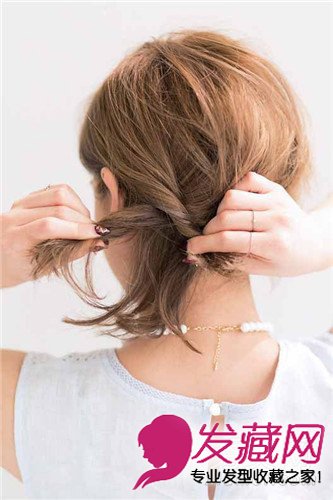 脖颈处留取少许头发后,将脑后头发朝左右分开,在左耳后侧拧转后汇拢成一股,用发夹固定。