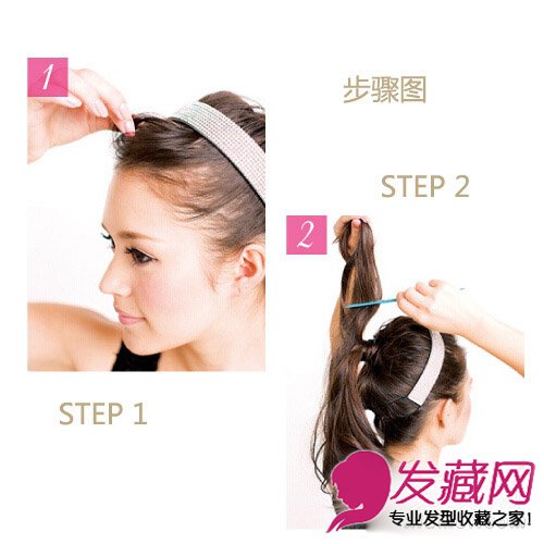 step 1:将头发全部集中扎成低马尾,带上准备好的发箍,用手轻轻来出一些发丝,营造出好看的头型与脸型。