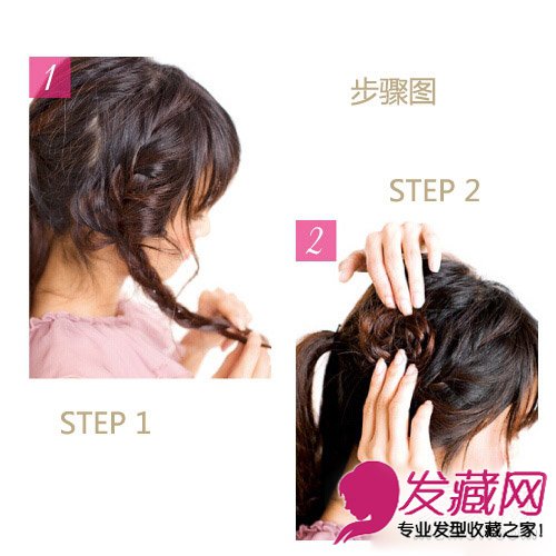 step 1:在右侧取一小束头发编成三股辫,用小橡皮筋固定。