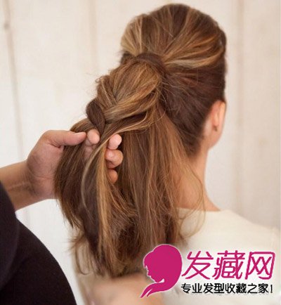 5.在马尾最上层分出三束头发,用来编麻花辫,然后依次从两侧各自加入新发进行编织
