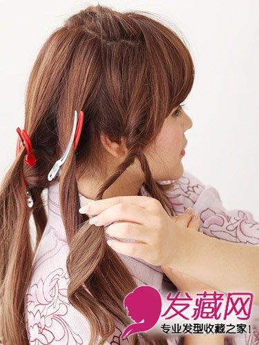 step3:将右侧的头发如图分成三部分后扭转成发辫。