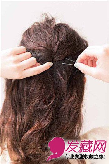 将头顶~稍后侧的头发松散的向后拧转,留取较长发梢后用发夹固定在脑后。