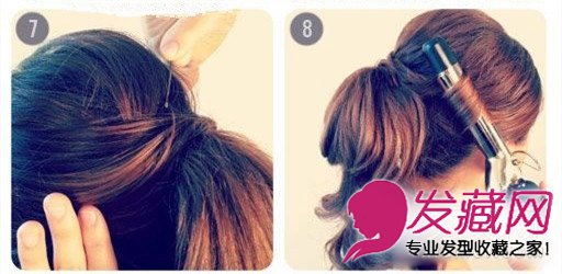 STEP4 从另一侧的刘海也抽取一束头发出来缠绕住马尾,然后用卷发电热棒把马尾分成几股电卷。