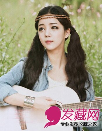 同样将韩式水波纹烫发打造出双马尾的造型,气质的中分将发丝划成两部分。低扎的双马尾轻松打造出文艺小清新的气质感,发饰的点缀更显甜美与动人气质。