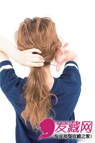 把头发随意集中起来在较低的位置用发圈扎起。只把发梢再一次弄出明显的弧度。
