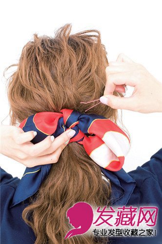 把折成细细的丝巾在发圈的结头上扎一个蝴蝶结。为了避免散开用发卡固定住丝巾的结头。