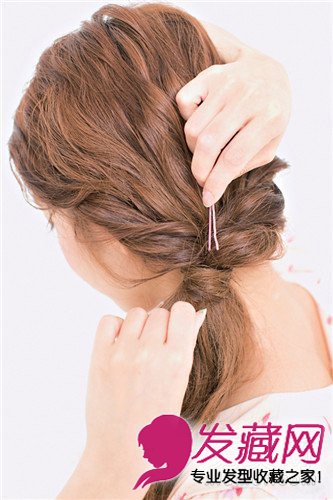 把发卡向下别,固定发束。后面的头发少量抓出并任意抽拉,弄出蓬松感。