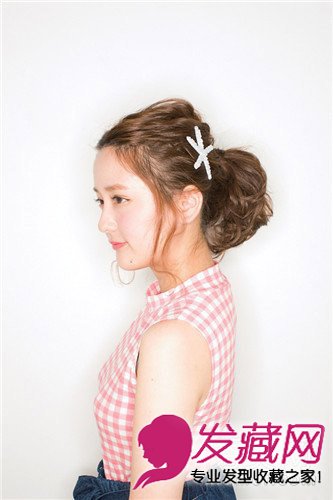 在额头和耳朵延长线上的高起处有个结头般粗略集中成一束后用细发圈扎起。