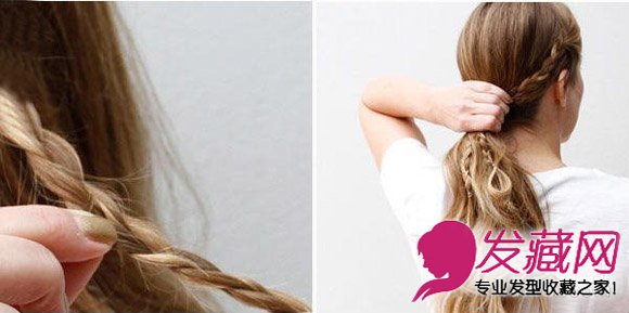 将编好的两个辫子和剩余的头发放在一起,扎一个低马尾。