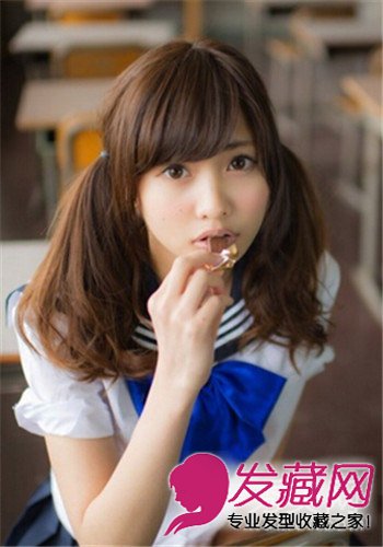 慵懒中双马尾的秘诀就在于头发的蓬松感,此款发型在发尾处运用了小发卷,使两个大马尾看上去十分饱满,起到修饰脸型的作用,厚重的刘海搭配的恰到好处。