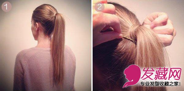 首先扎一个高马尾辫,用一缕头发缠绕在皮筋上,用发夹固定好。
