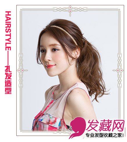 高耸的卷发马尾活力十足,前额的刘海妩媚修颜,精致的水晶发箍更显得俏丽迷人。
