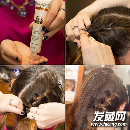 先用头发精油抚平毛躁头发,使头发顺滑,之后在头发的右边部分完成一个三股辫发。