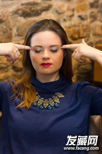 Step 2:用食指从眉梢开始向后将头发分成上下两部分,将上面的头发扎成马尾。