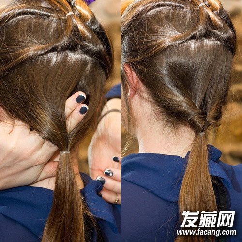 Step 5:将第二个马尾用卡子固定在上方,把剩下的头发扎起来,重复step3的动作。