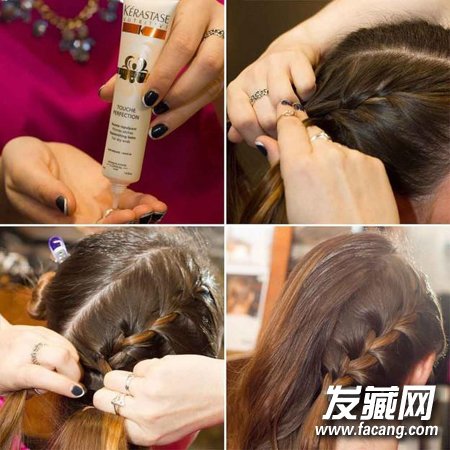 Step2:使用精油抚平毛躁的头发,将右边部分的头发向后编成三股编发。