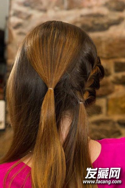 Step3:将剩下的头发分为两部分,上面的头发用皮筋扎成马尾。