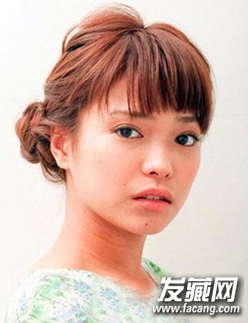 这款日系风格的盘发型也适合圆脸mm哦,中长发在脑后编发盘起来,棕红色染发显得甜美靓丽,碎发的短刘海修颜又不会显得厚重。