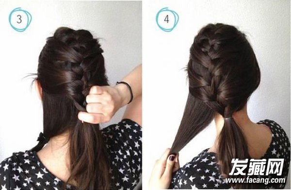 将蜈蚣辫编到后面发际线的位置后用皮筋固定,松开耳朵旁的那束头发。