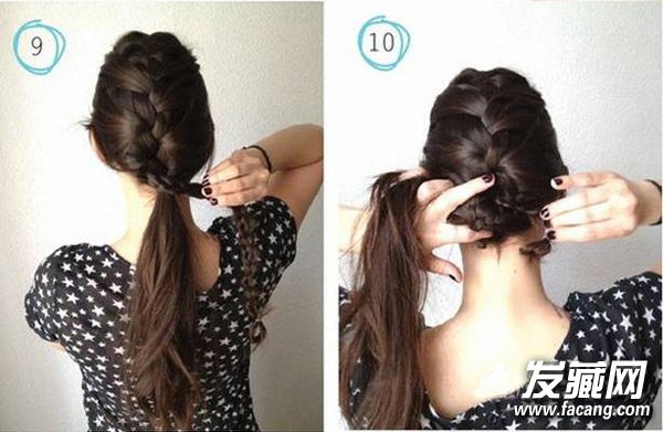 将编好的麻花辫缠绕住在第三步固定好的马尾,多缠绕几次,要遮盖住皮筋。