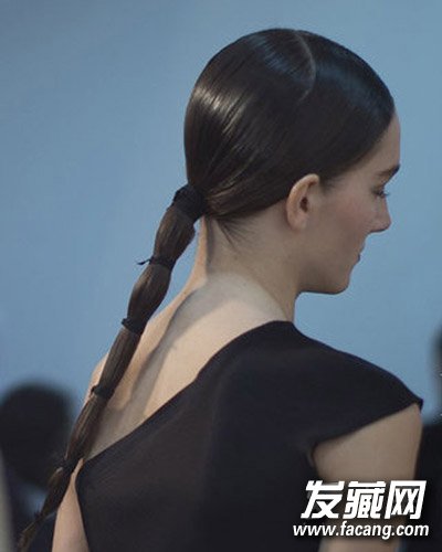 发型师先将模特的头发全都往后梳,紧贴头部,打造出光洁的模样;然后在将长发聚成一束,用超多的润发啫喱和喷雾将其尽可能的束紧固定,接着用黑色的皮筋将马尾箍成竹节一样一节节的样子,固执而挺拔。