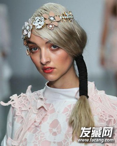 Bora Aksu秀场上的马尾并不放在背后,而是斜放在肩的一侧。造型师将模特的头发全都分到一侧,头顶部分用造型发胶打造出蓬松的立体感,马尾部分则用长长的黑色发带捆束住头发,如果你觉得黑色的发带并不适合亚洲人的发色,你也可以选用彩色的,但最好选择素雅一点的,才能衬托出清纯的意味。发尾是参差不齐的,显得更加自然随意。最后斜戴上唯美的花型发饰,使整体造型看上去像一个公主,更像是一个来自耶稣身边的仙女。