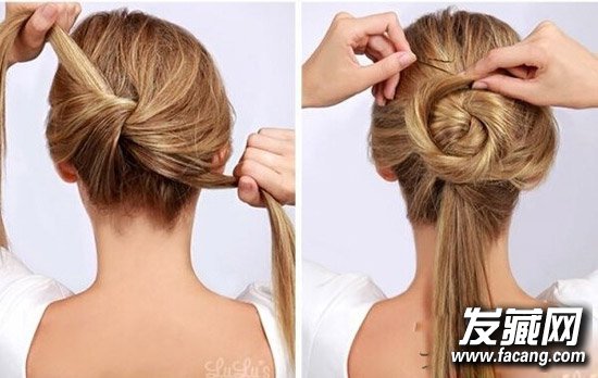 Step4 将右侧头发顺着中间的结,缠绕,用卡子扣好。