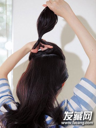step1:取出上半部分头发,绑成马尾后内扣。