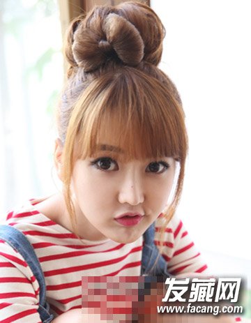 蓬松的花苞头盘发就是不错的选择哦, 可爱的长刘海裁剪整齐然后柔顺的发丝加上头顶的花苞头发型显露出无比的时尚感来。