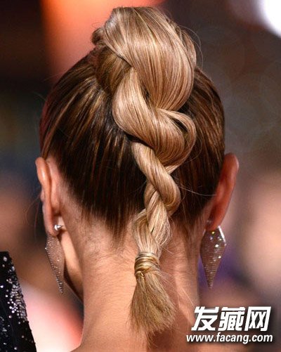 将扎好的马尾分成三股,一股围绕马尾的固定的位置,另外两股相互扭转,并在发尾处进行固定。