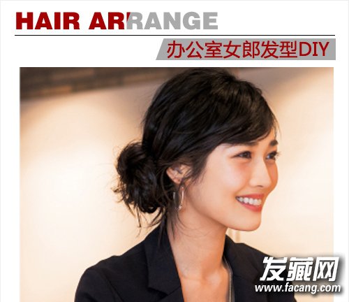 比较成熟大气的一款OL盘发,圆弧状的斜刘海很好地修饰了脸型,而黑色发色和低低的盘发更显温婉稳重的气质。