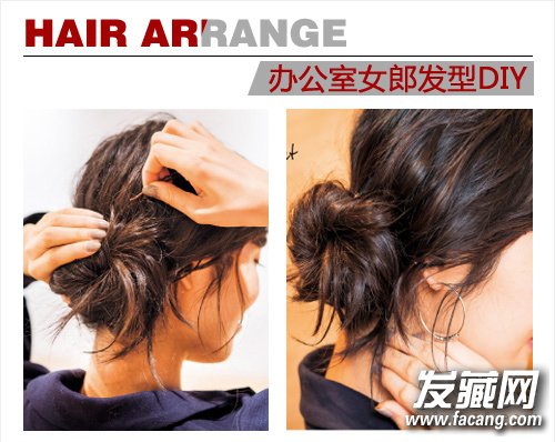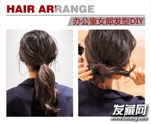 扎一个低马尾是这款发型的基础,然后将马尾按顺时针方向慢慢地扭转至盘起。