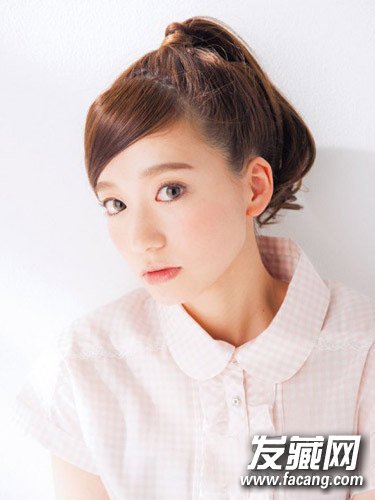 饱满的斜刘海紧贴额头,衬托出白皙饱满的额头。高耸的马尾清爽立体,十分减龄。