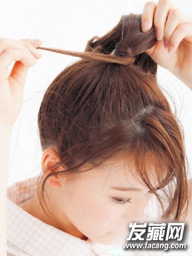 step1:将头发绑成高耸的马尾后取出一束头发缠绕橡皮筋。