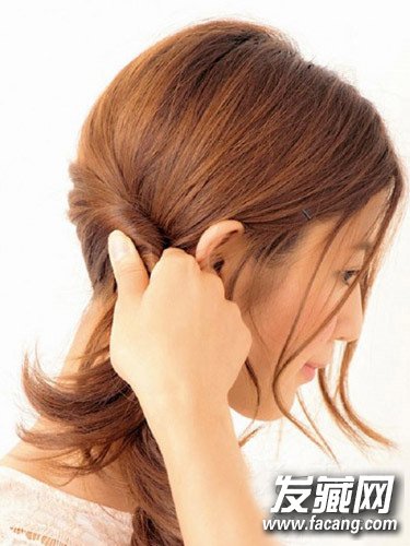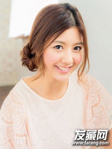 中长发扭转成别致蓬松的发包,侧边扎发展现出优雅甜美的气质,侧分长刘海烫出微卷弧度,棕色发色洋溢出浪漫光泽,清新动人。